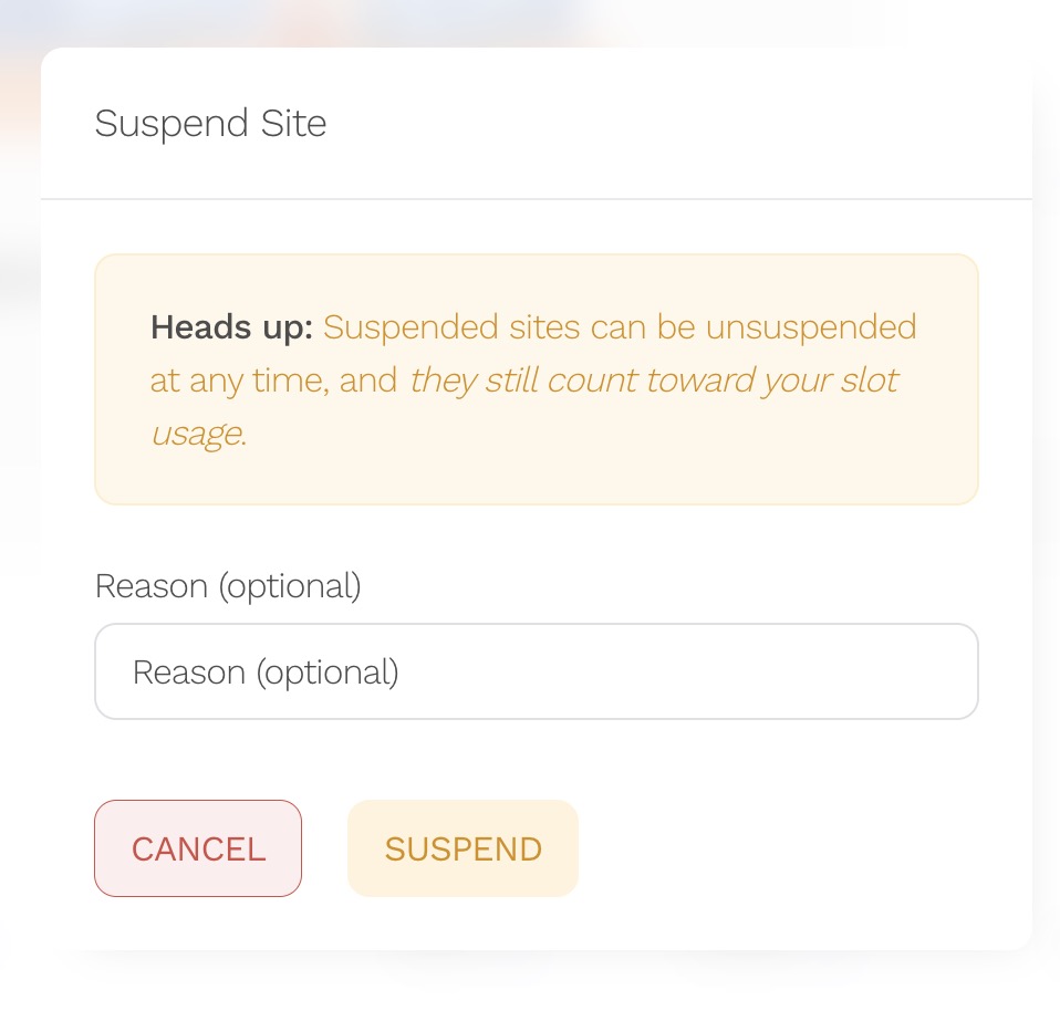 ⚠️ Notice: Suspended hosting slots are still stored on the server. They are simply inactive, but they still count towards your total number of hosting slots.