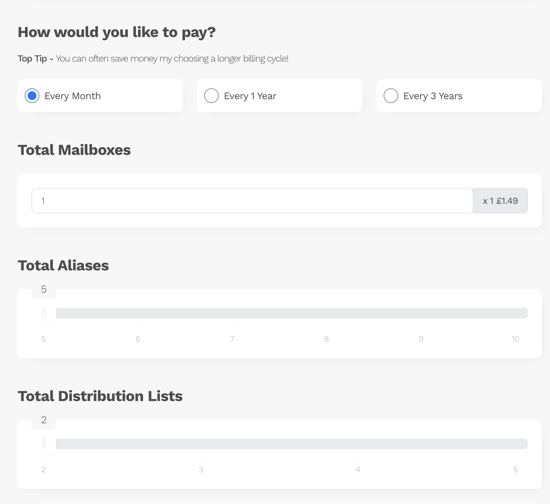 Note: Mailbox costs are prorated at the time of ordering. This means your initial payment may be slightly more or slightly less than the standard price, depending on where you are in your billing cycle.