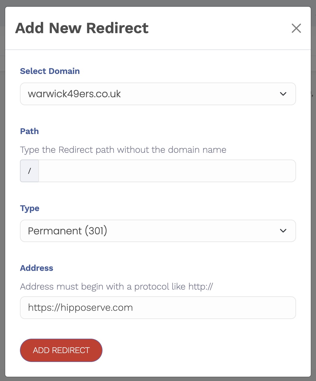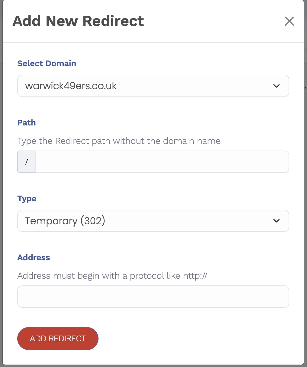If you want to redirect the entire domain to another website, simply leave the redirect path fields blank.